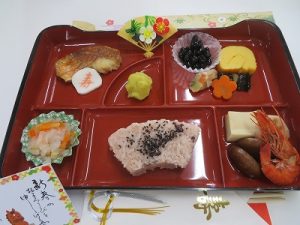 この他に、獅子舞と一緒に睨み鯛と祝い酒を持って各ユニットに行き、利用者様に召し上がっていただきました!