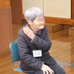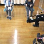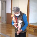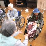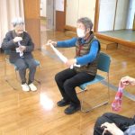 その後、ゴム紐を使って楽しく体操を行い、お手玉を使って二人ペアになって一緒に昔懐かしい遊びをしました。